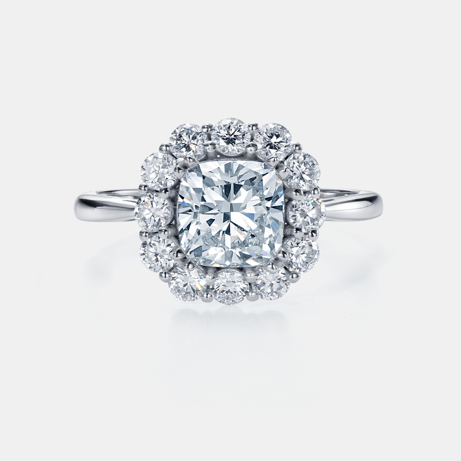 Вдохновлённое утончённой классикой, это кольцо с лабораторно выращенными бриллиантами в белом золоте 585 пробы — воплощение королевской элегантности. В центре композиции — бриллиант редкой кушон-огранки, сочетающий мягкость форм с чёткой архитектурой. Его сияние многократно усиливается обрамлением из круглых камней, создающих эффект цветущего венца света.
